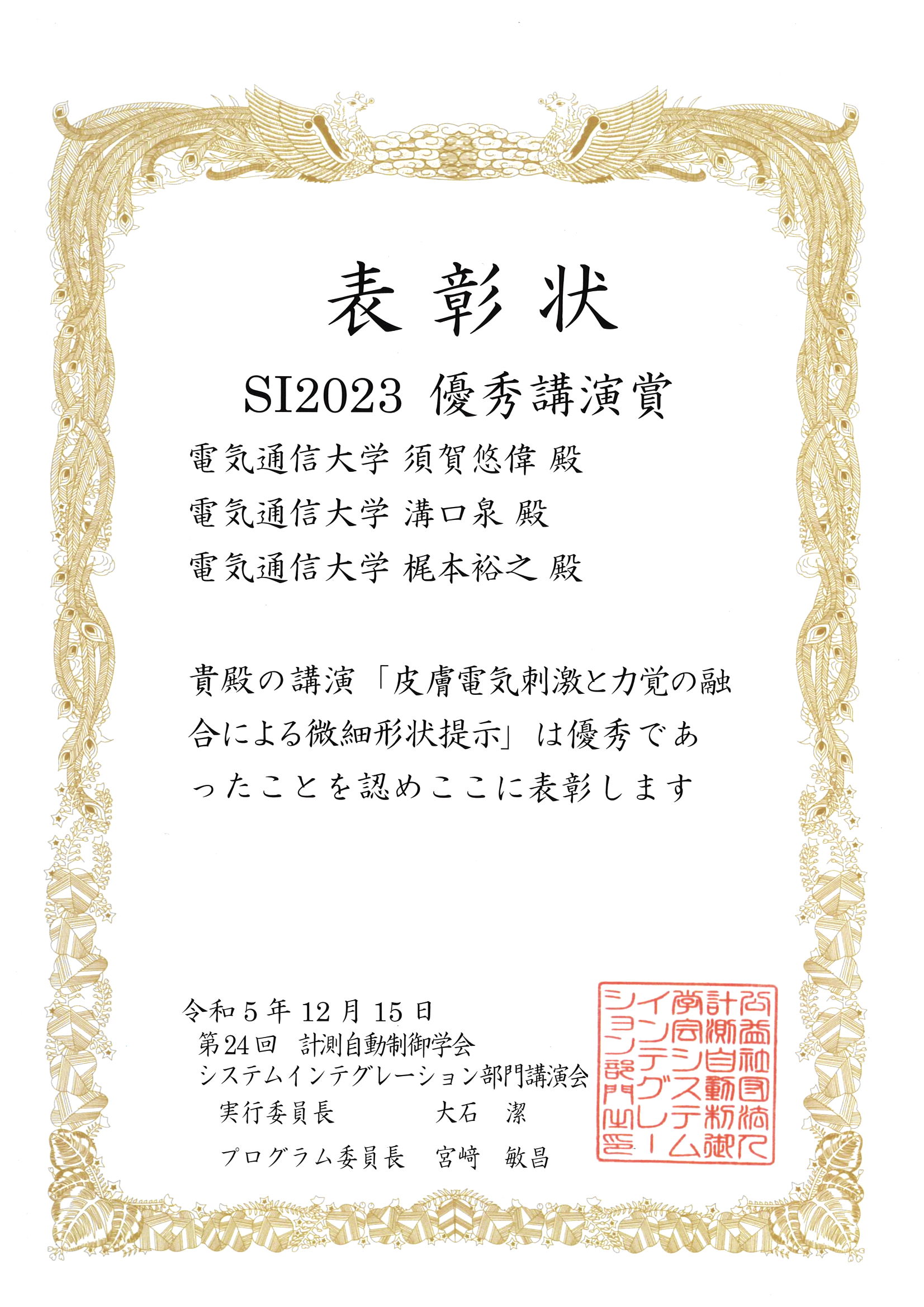 2023年12月14日から16日の間、新潟県で開催された第24回計測自動制御学会システムインテグレーション部門講演会 (SI2023)にて、梶本研究室の須賀悠偉さん(情報学専攻 博士後期課程2年)が優秀講演賞を受賞しました。