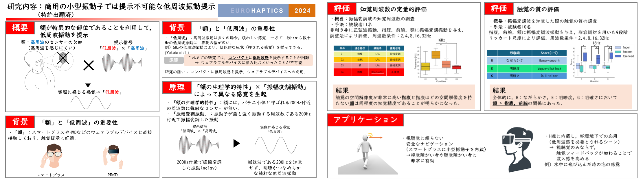 • Utilizing Absence of Pacinian Corpuscles in the Forehead for Amplitude-Modulated Tactile Presentation, EuroHaptics 2024, 2024.7, France Lille, Technical Paper, Oral Presentation (in press)