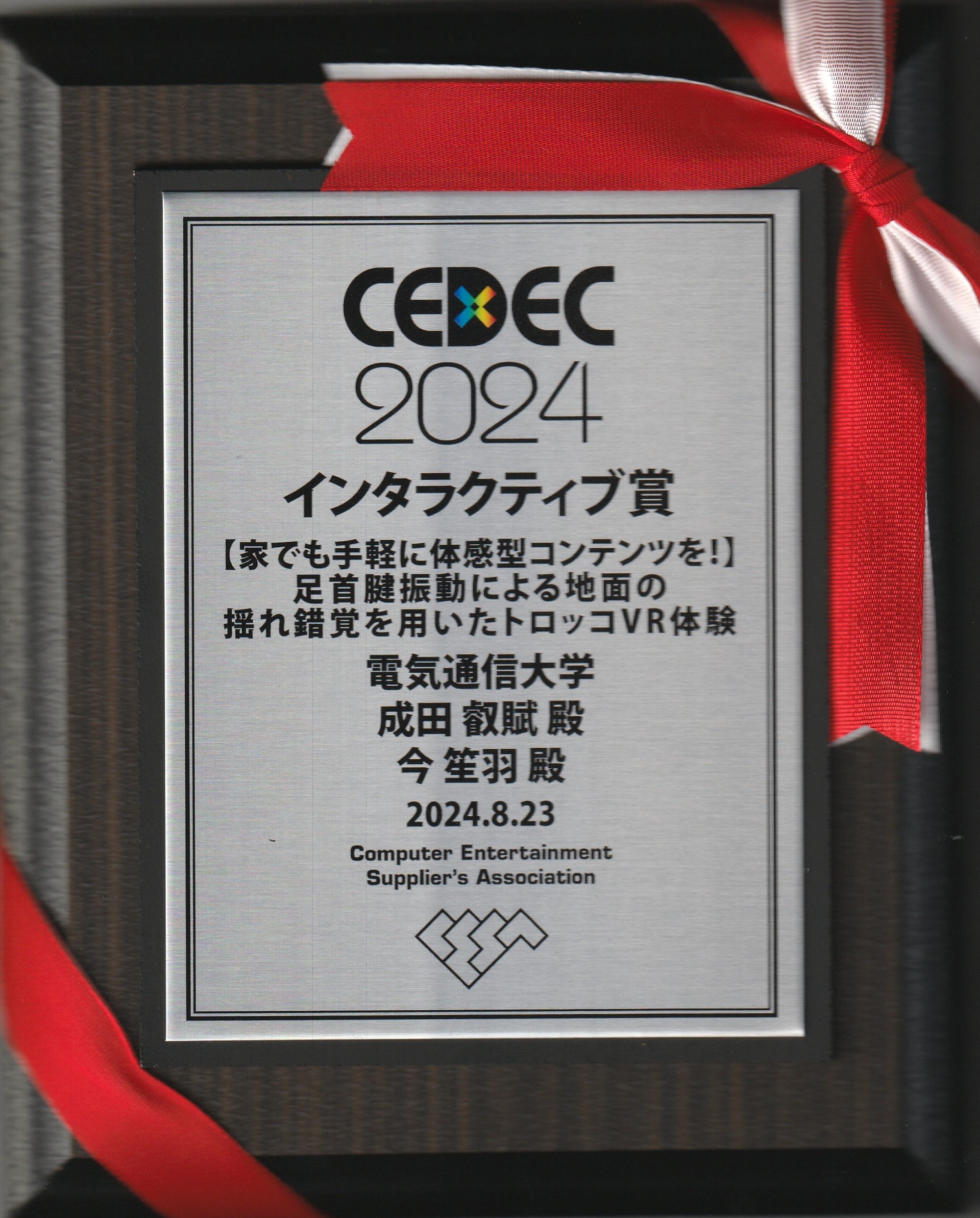 2023/08/21-23、パシフィコ横浜にて開催されたCEDEC2023にて、成田叡賦君(情報学専攻修士2年,梶本研究室)がインタラクティブセッションにてインタラクティブ賞を受賞しました。