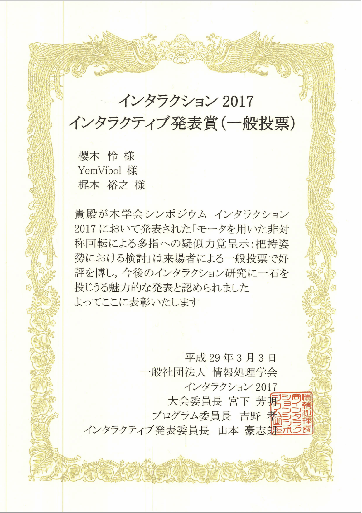 2017年3月2~4日の間、東京にて開催された学会インタラクション2017にて、櫻木怜 君(情報学専攻1年,梶本研究室)がインタラクティブ発表賞(一般投票)を受賞しました。