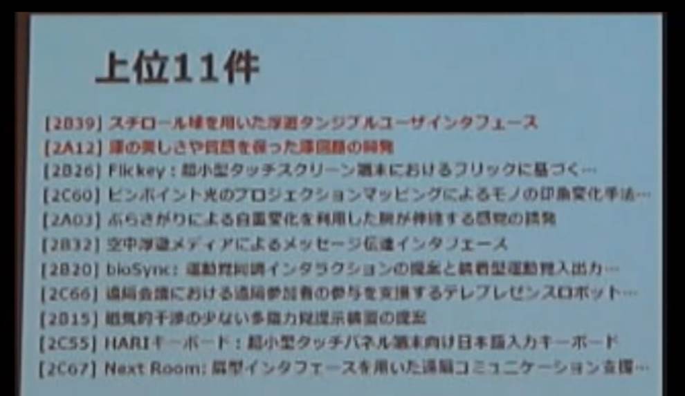 - 2014.2.27-3.1 中井優理子,工藤慎也,岡崎龍太,梶本裕之,栗林英範:ゲルのせん断変形を用いたタッチパネルにおける水平方向力入力,;インタラクション2014(第17回一般社団法人情報処理学会シンポジウム) ,212-215.[pdf]【プレミアム発表(全投稿数中28.3%)・2/27一般投票52件中8位】