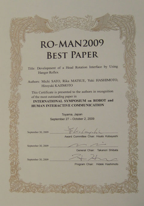 - 2009.9.30 IEEE ROMAN2009にて佐藤未知さん(博士前期課程1年)がベストペーパー賞を受賞しました.