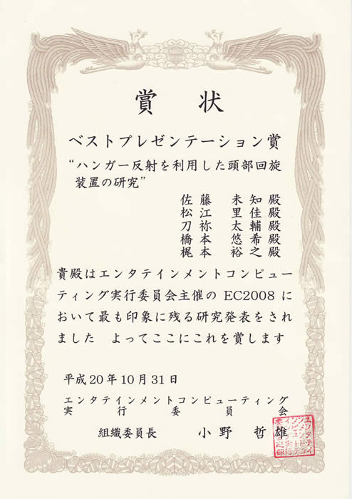 - 2008.10.31 エンタテインメントコンピューティング2008にて佐藤未知さん(学部4年)がベストプレゼンテーション賞を受賞しました.