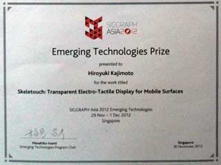Hiroyuki Kajimoto (Associate Professor) received Emerging Technologies Prize in SIGGRAPH ASIA 2012