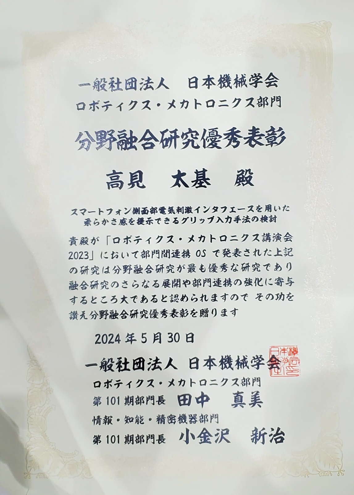 2023年6月28~7月1日の間,名古屋にて開催されたロボティクス・メカトロニクス講演会2023にて,高見太基 君(情報学専攻博士前期課程卒業,梶本研究室)が分野融合研究優秀表彰を受賞しました.