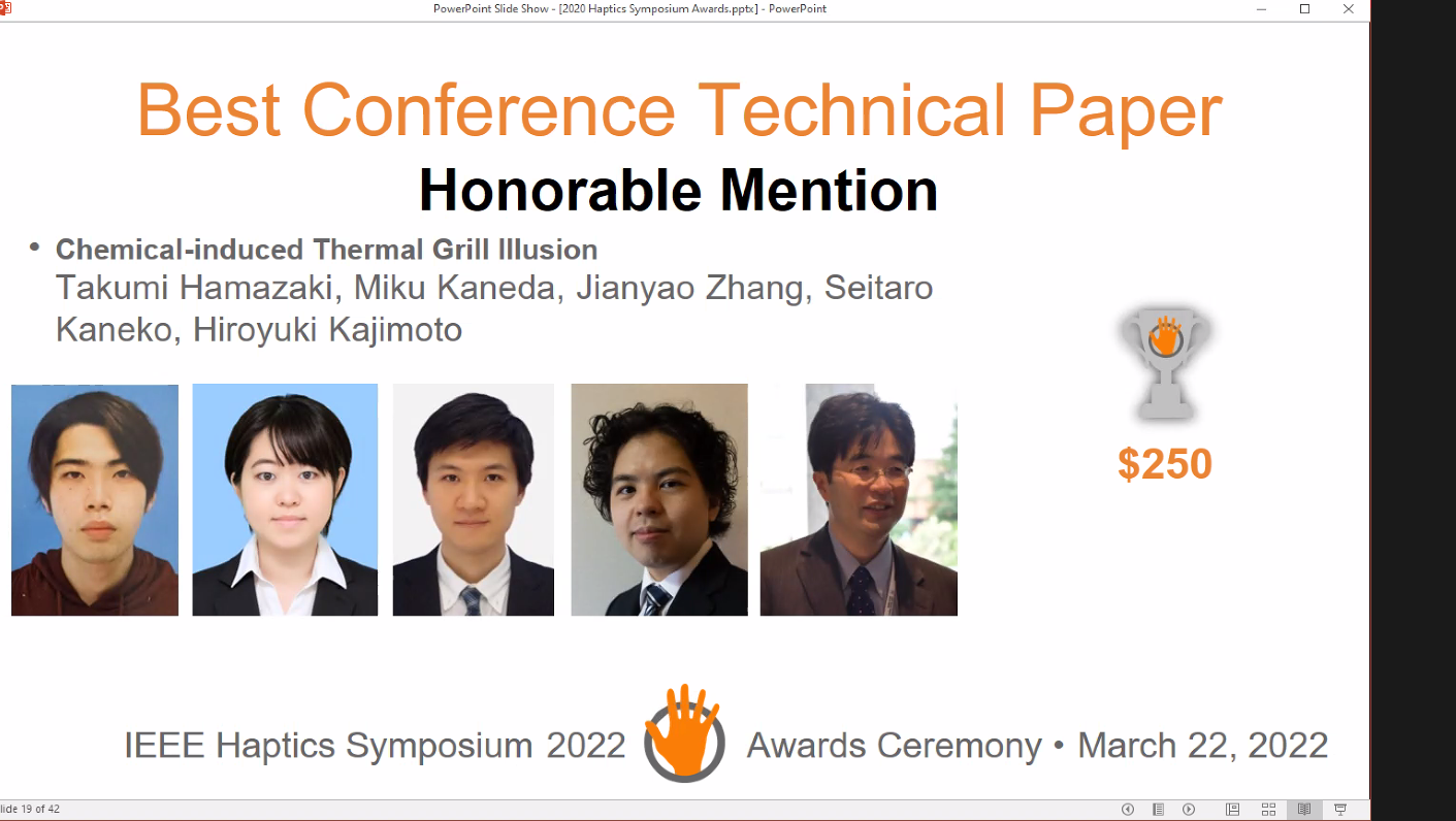 Takumi Hamazaki (Ugrad student) received Best Conference Technical Paper Honorable Mention at IEEE HapticsSymposium 2022†