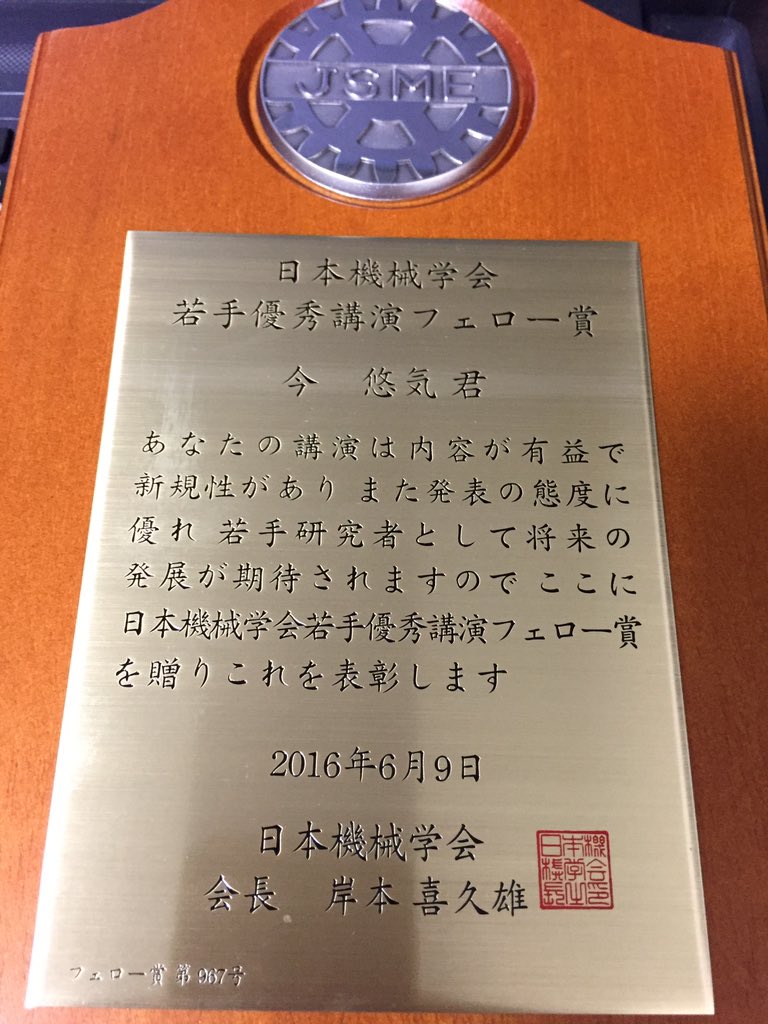 2015年5月17~19日の間京都にて開催された学会ロボディクス・メカトロニクス講演会2015にて、今悠気 君(情報学専攻1年,梶本研究室)が若手優秀講演フェロー賞を受賞しました。
