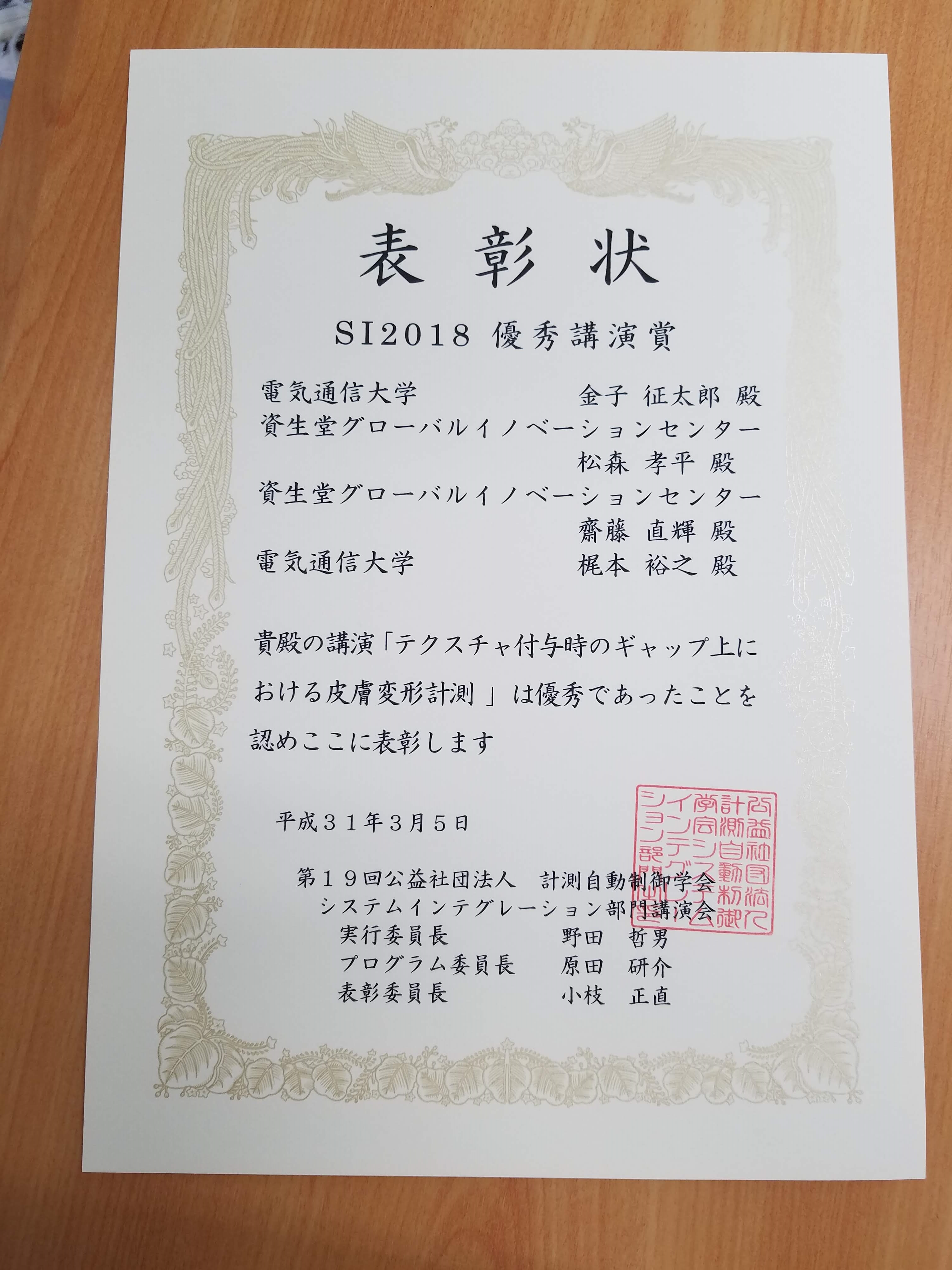 2018/12/13-15の間、大阪工業大学にて開催された学会計測自動制御学会システムインテグレーション部門講演会にて、金子征太郎君(情報学専攻修士2年,梶本研究室)が優秀講演賞を受賞しました。
