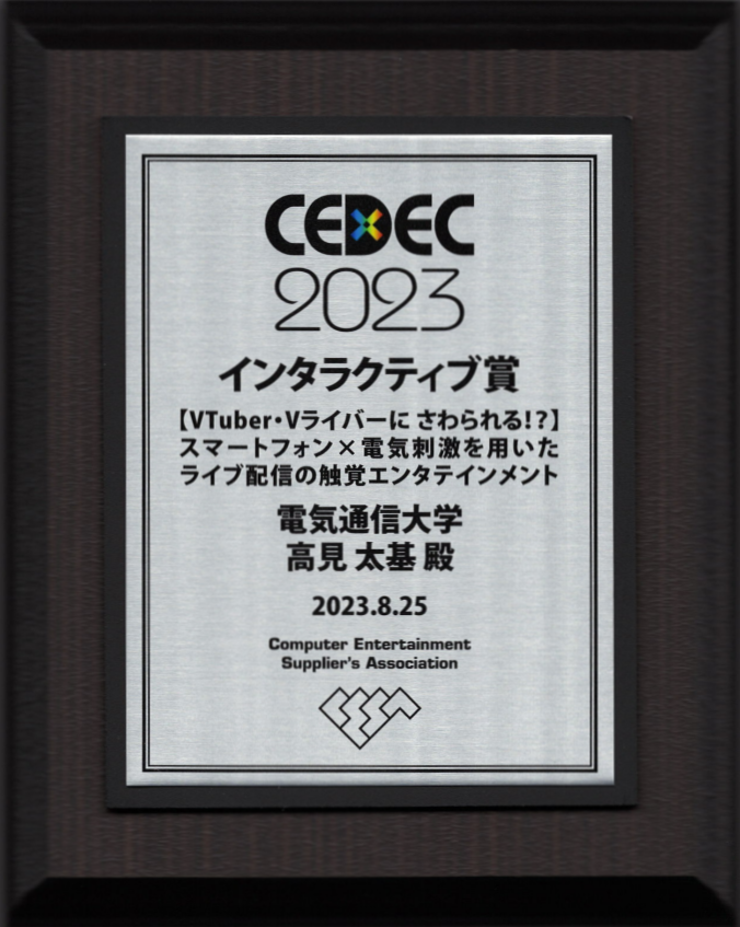 2023/08/23-25の間、パシフィコ横浜にて開催されたCEDEC2023にて、高見太基君(情報学専攻修士2年,梶本研究室)がインタラクティブセッションにてインタラクティブ賞およびオーディエンス賞(2位)を受賞しました。