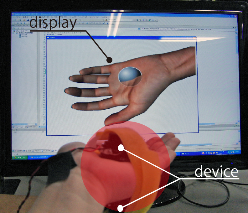我々は手の平と手の甲にスピーカを固定した装置を用い,これらの振動子を同期させて振動させることで,その間の体の中に感覚を提示する.