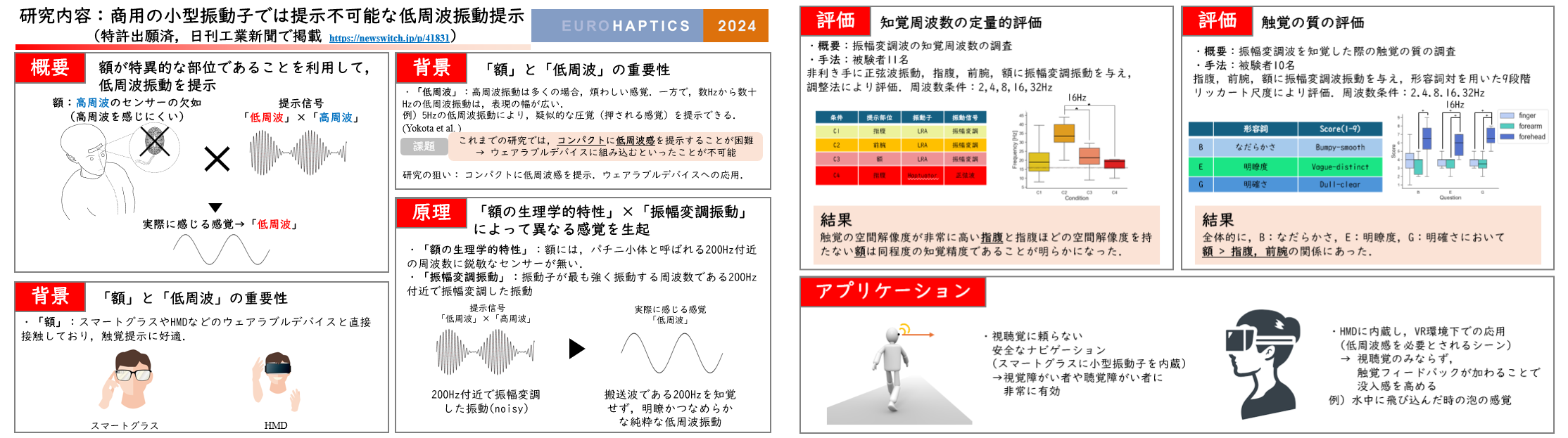 - Demonstration of Forehead Amplitude-Modulated Tactile Presentation Utilizing Absence of Pacinian Corpuscles, EuroHaptics 2024, 2024.7, France Lille, Demo