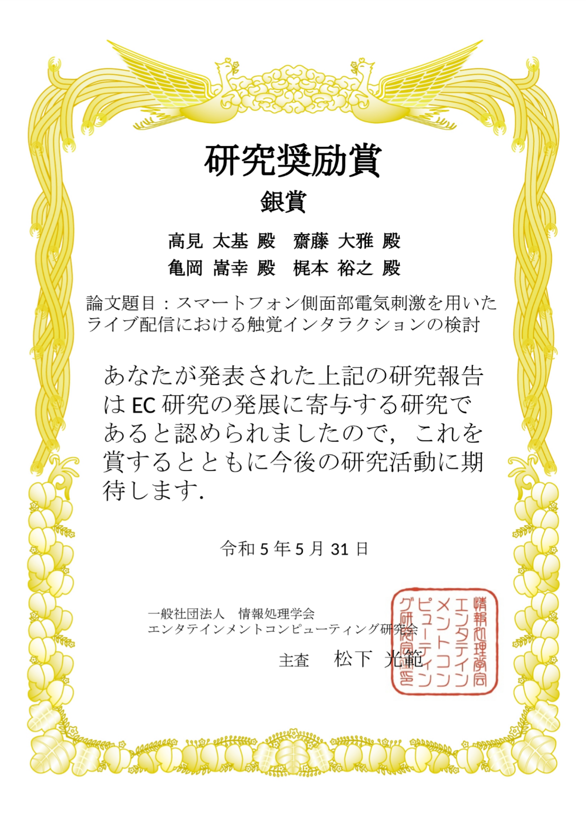2023/03/16-17の間、京都府(芝蘭会館別館)にて開催された第67回情報処理学会エンタテインメントコンピューティング研究会にて、高見太基君(情報学専攻修士2年,梶本研究室)が研究奨励賞(銀賞)を受賞しました。