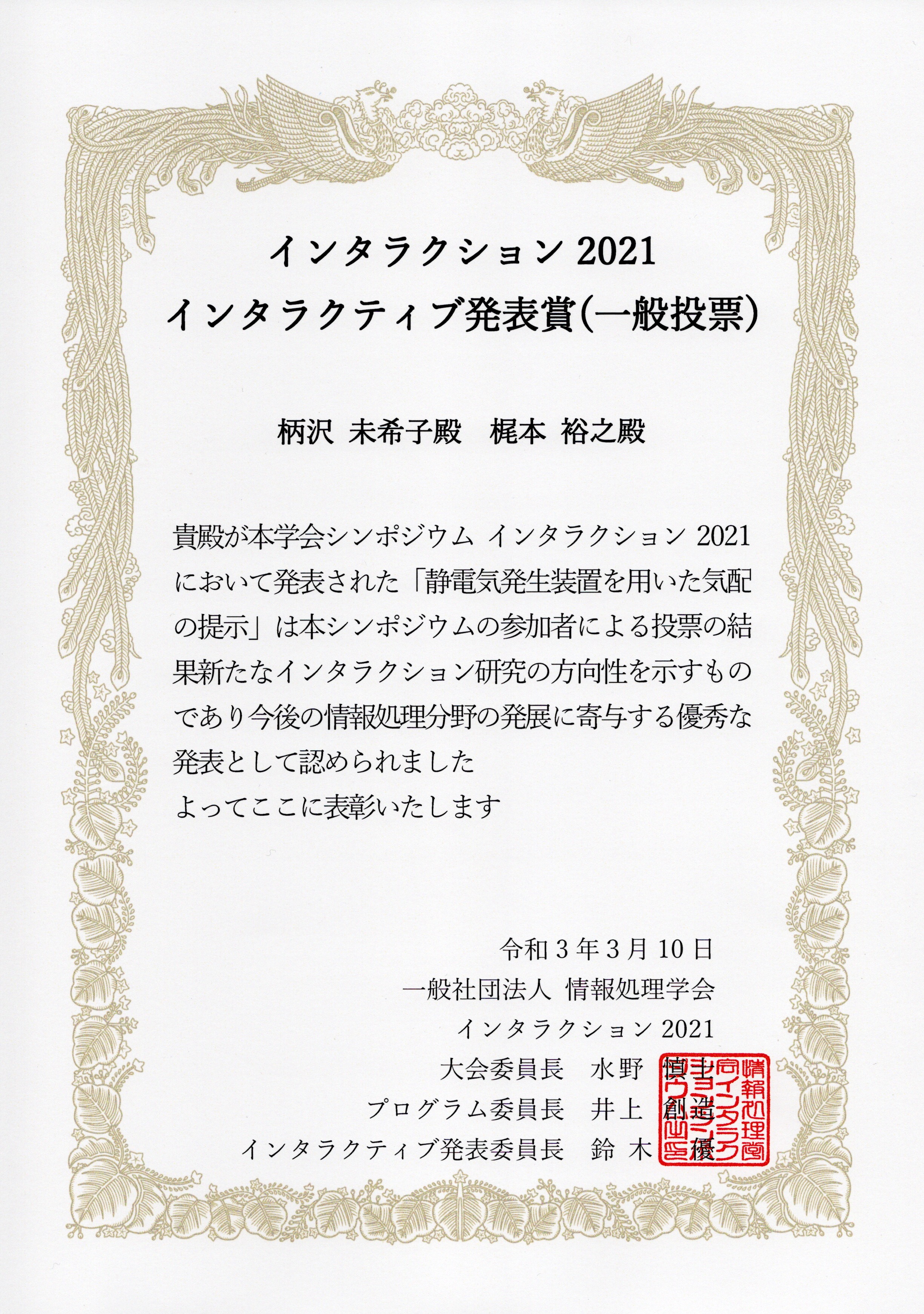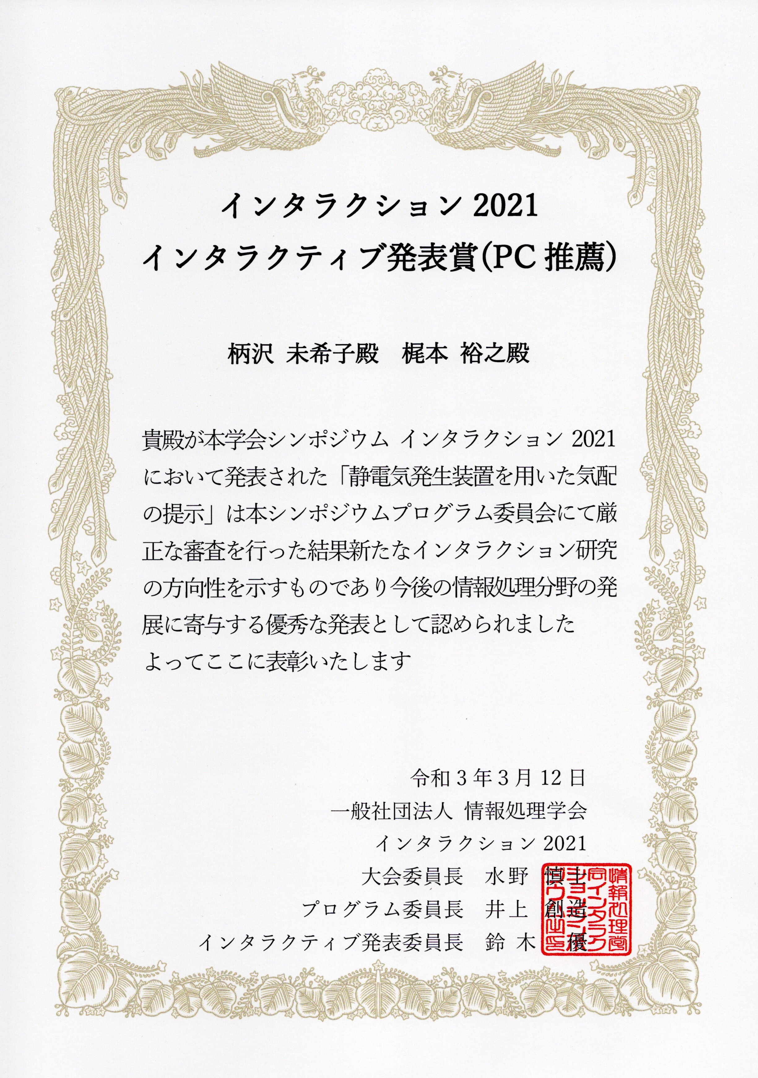 柄沢未希子 さん(情報学専攻 博士後期2年)がインタラクション2021(第25回一般社団法人情報処理学会シンポジウム)で、インタラクティブ発表賞(PC推薦)とインタラクティブ発表賞(一般投票)を受賞†