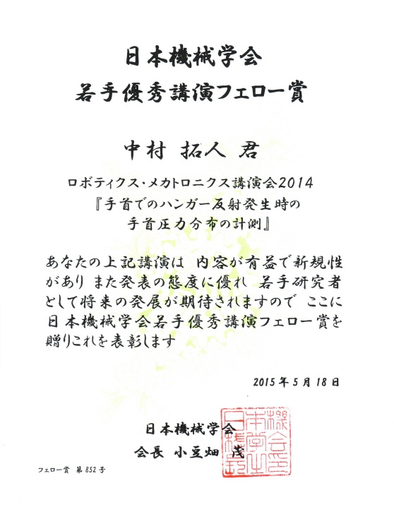 2014年5月25~29日の間富山にて開催された学会ロボディクス・メカトロニクス講演会2014にて、中村拓人君(総合情報学専攻2年,梶本研究室)が若手優秀講演フェロー賞を受賞しました。