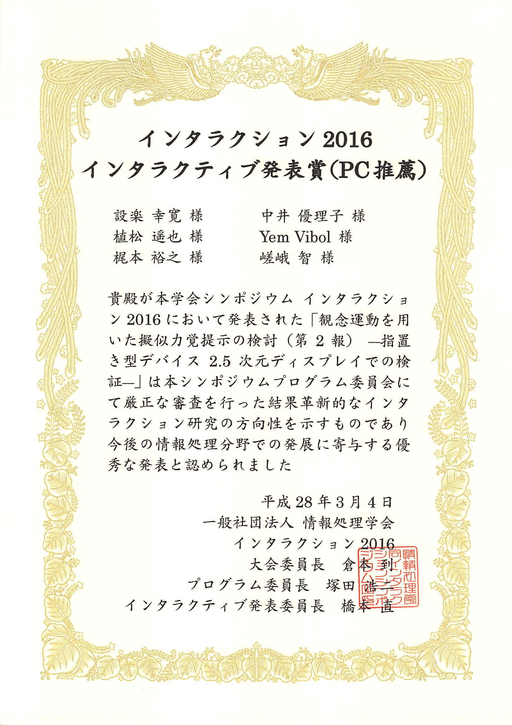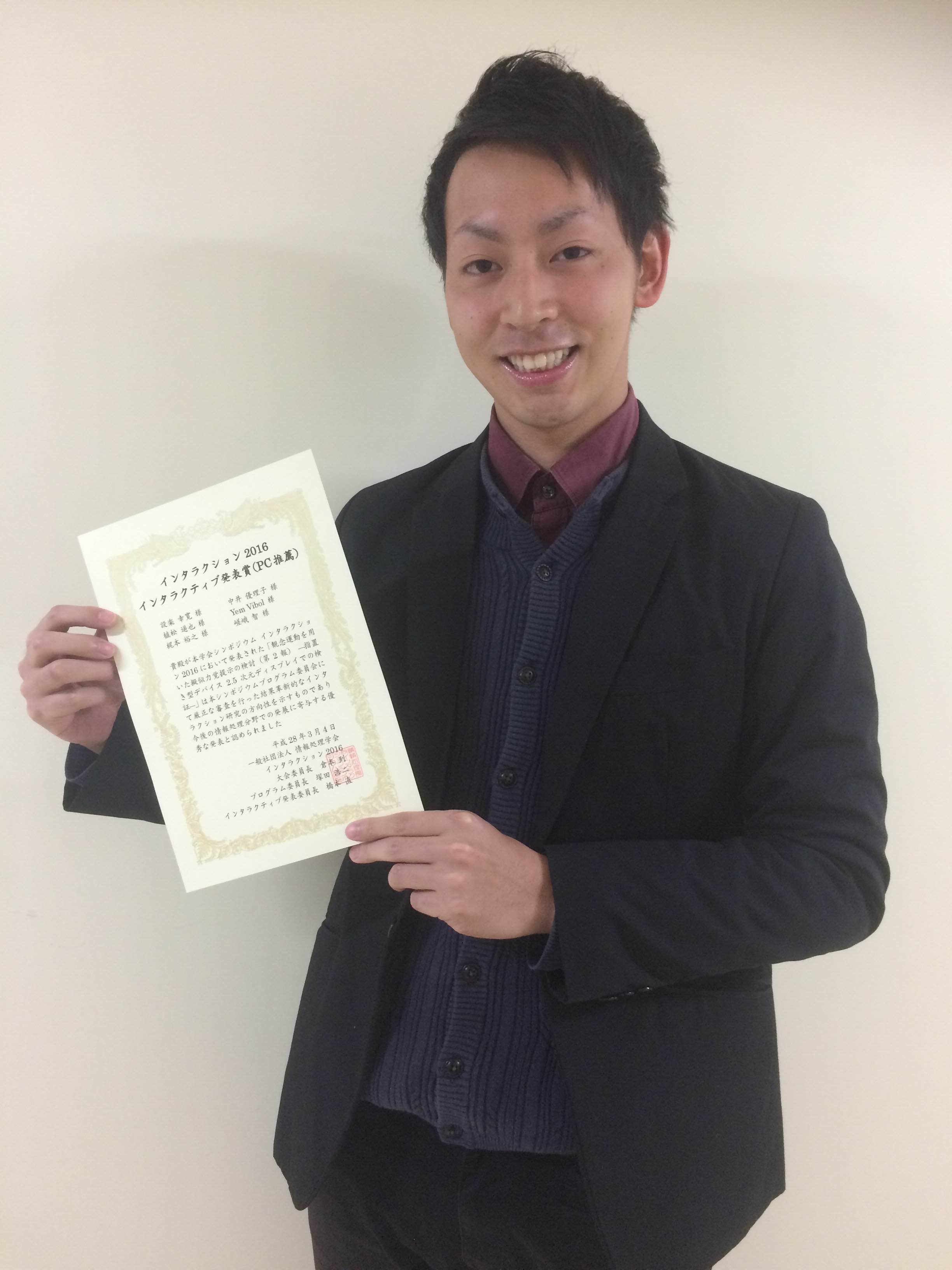 2016年3月2~4日の間,東京 科学技術館にて開催された学会インタラクション2016にて、設楽幸寛君(先端工学基礎課程学部4年,梶本研究室)がインタラクティブ発表賞(PC推薦)を受賞しました。